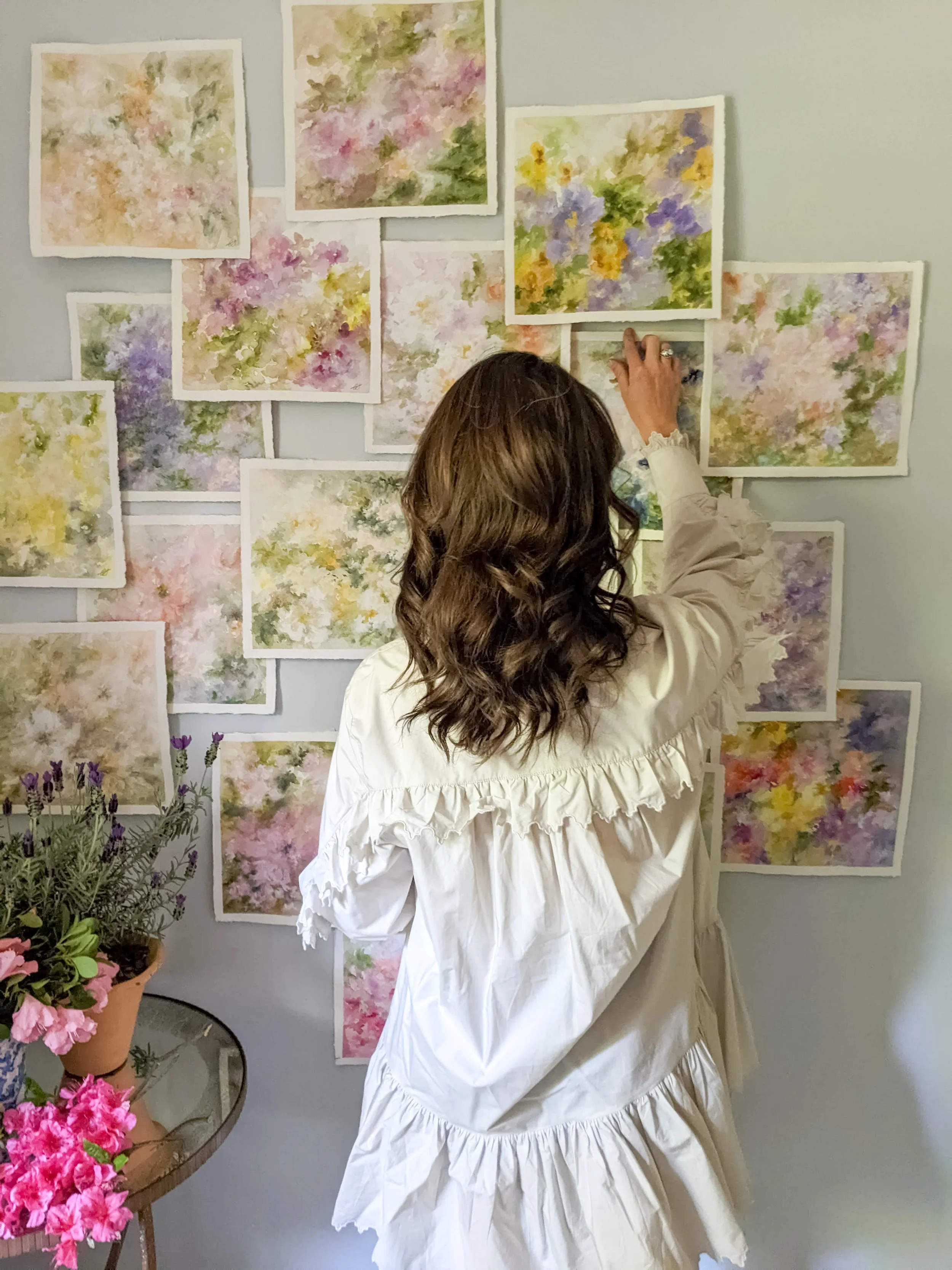 The abstract watercolor florals were a concept brought out of the inspiration of the cold, grey, and dreary time of year where days on end of snow, rain, and dark and dreary skies eventually give way to beautiful blooms as the first signs of new life begin to emerge all around. The water blurring and obstructing them as if looking through a window pane (hence the square sizes) in the midst of an early springtime shower. Hope in the midst of a storm. The proverbial silver lining. The truth is, I really struggle with winter as a season. On top of that annual generalization, the first quarter of this year was a wild ride right out of the gate of big, scary and course altering fires and little, pestering fires culminating everywhere and before I knew it I was fully engulfed. Tis the ebb and flow of life for sure, but the metaphorical flames left me in a disorienting fog of smoke so thick that made it hard to navigate for a bit as the dust began to settle which is a bit out of my ordinary realm of recall… Spring is by far my favorite of all seasons because of the breath of life it brings and this one was no different, or perhaps, completely different because it lifted me out of that valley with each sweet, intimate God wink and the goodness of hopeful promises all around, even in the midst of it all still. I welcomed a deliberately slow pace of exploration without expectations or agendas and each work of this series came about organically over weeks and weeks as new blossoms bloomed all around and I carefully collected them and filled my studio space with vases of new thing after new thing. Each brushstroke became very meditative and prayerful and it was a real journey of personal growth to paint them all so carefully and intentionally. To focus in intently on the beauty and promise and goodness even in the midst of chaos.
